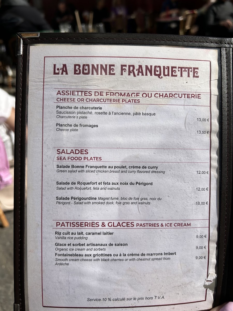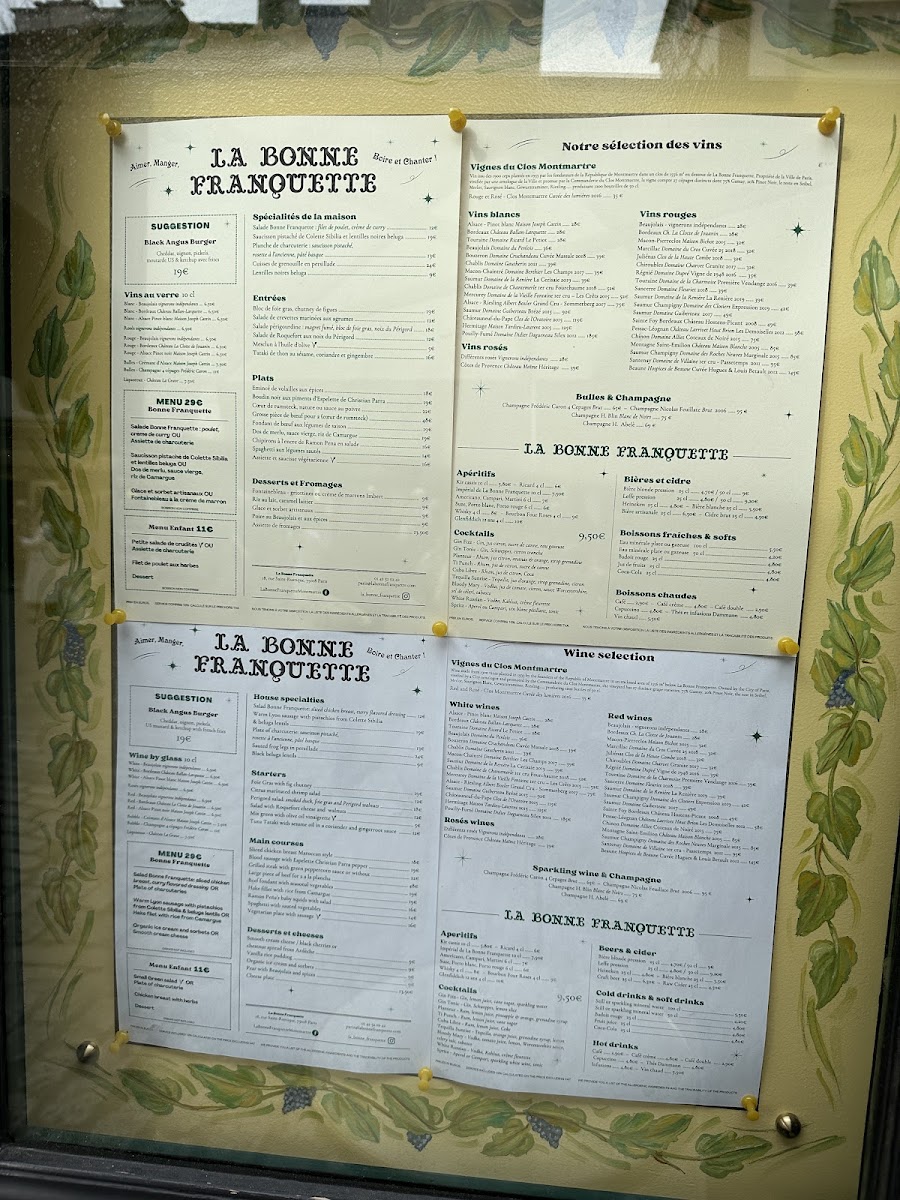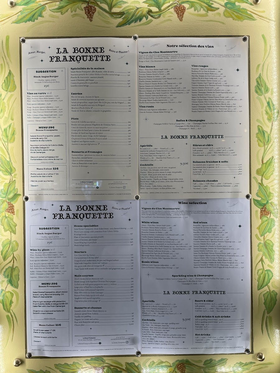 Welcome to La Bonne Franquette, tucked away at 18 Rue Saint-Rustique, a hidden gem in Montmartre, Paris. This charming eatery offers a delightful menu that emphasizes traditional French cuisine with a modern twist. The Bonne Franquette Menu is a culinary journey, featuring the Bonne Franquette salad with chicken and curry cream, succulent Six Burgundy snails, and a comforting Beaujolais beef estouffade paired with honey carrots, all for €27 each. The Bistro Menu, available for lunch, presents simpler yet equally enticing options like country terrine and fish fillet for €19.